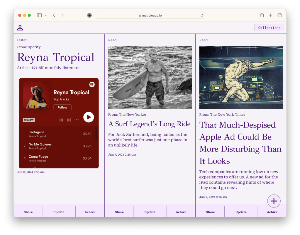 The result is that Magpie is a pretty handy wallet for interesting and useful content and a much more fulfilling alternative to aimless fidget scrolling. There’s always something compelling to read, or watch, or listen to.