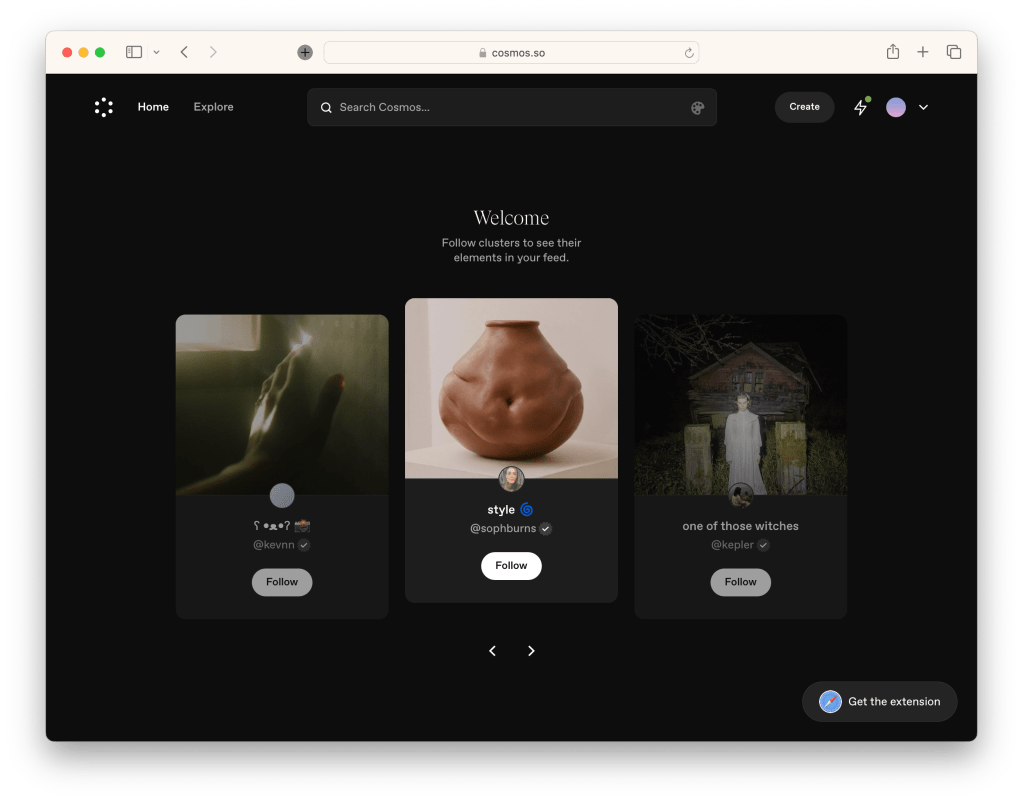 Cosmos. It’s pretty easy to draw comparisons between Cosmos and Pinterest, but that’s mainly due to the familiar masonry grid UI. However Cosmos is trying to become the antidote to the mindless doomscroll. Instead, it offers a gorgeous place to build and explore your interests. The aesthetic is pretty firmly aimed at visually oriented people.