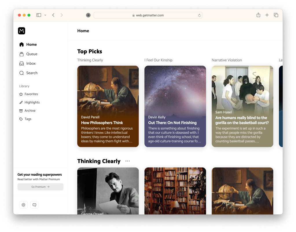 Matter. An evolution of the reader, Matter presents us with a lovely interface for saving and consuming the things we collect. It allows you to pretty much save anything you might want to read; links, PDFs, newsletters and passages. A very neat feature on offer is to move easily between text and audio. Podcast are transcribed, and articles can be read in using the latest, fairly human sounding, test-to-speech tech. Matter also wants to recommend you stuff which I have a bit of a problem with, but I’ll talk about that in another post.