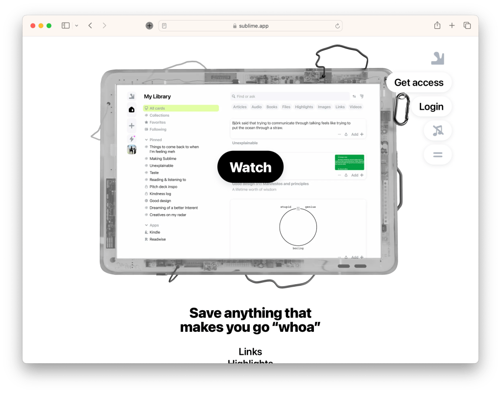 Sublime. Similar to Matter, Sublime offers to take in a wide variety of content, but focuses more on drawing connections and synthesizing ephemera into something more valuable. It also has some social connection features which presents the intriguing notion of connecting people through ideas. There’s also a DIY, merry band of creators, vibe that appeals to me.